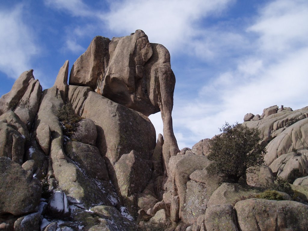 Ascenderemos suavemente hasta el Collado de la Cueva, donde nos uniremos a la Senda Maeso (PR-M1). Tras desviarnos para ver la Cueva del Ave María, retomaremos el ascenso hacia el Yelmo pasando por los riscos del Caracol, el Candelabro y el Ofertorio. Después, atravesaremos la Gran Cañada mientras divisaremos a nuestra derecha el grupo de Peñas Cagas y el Caracolete. En una curva abandonaremos la senda principal para adentrarnos en la diagonal de las Cerradillas. Tras llanear unos 600 metros, alcanzaremos la colosal figura del Elefantito.